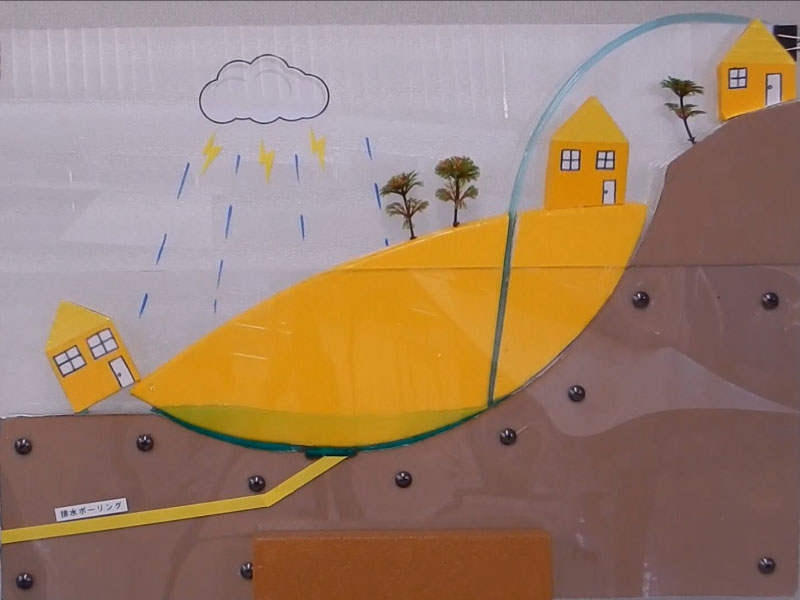 急傾斜地や地すべり地、砂防堰堤など斜面災害に関連した地質調査を行います。同時に地下水位や動態観測を行い、安定解析を行う場合もあります。